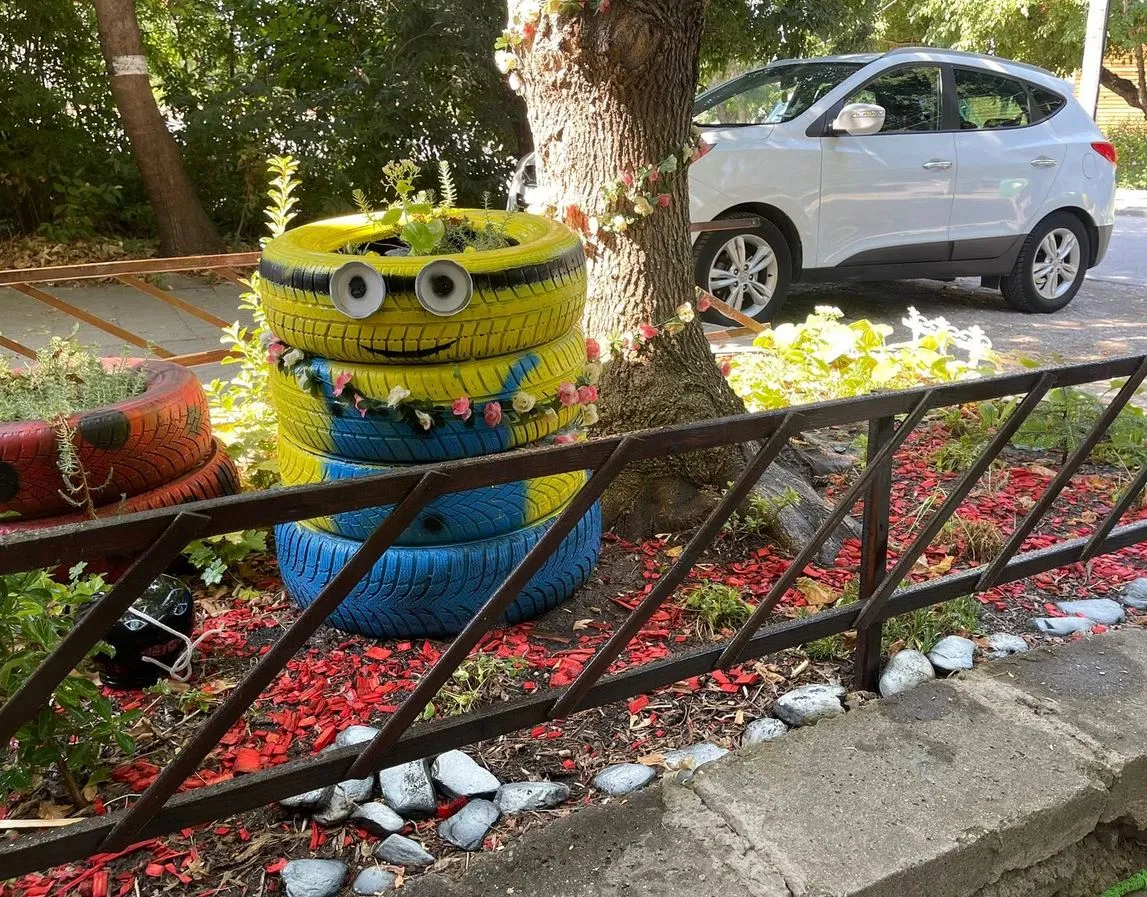 Дамата споделя и фотоси на уреденото пространство, защитавано от жълт миньон, основан от боядисани гуми, и скромна оградка.