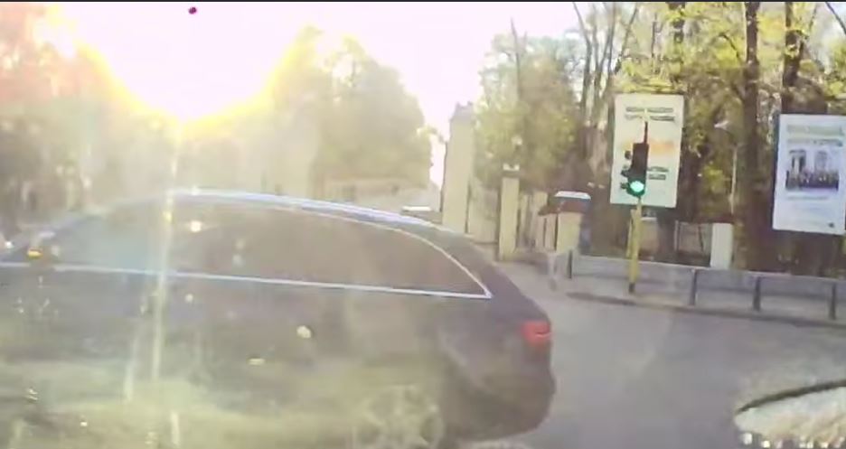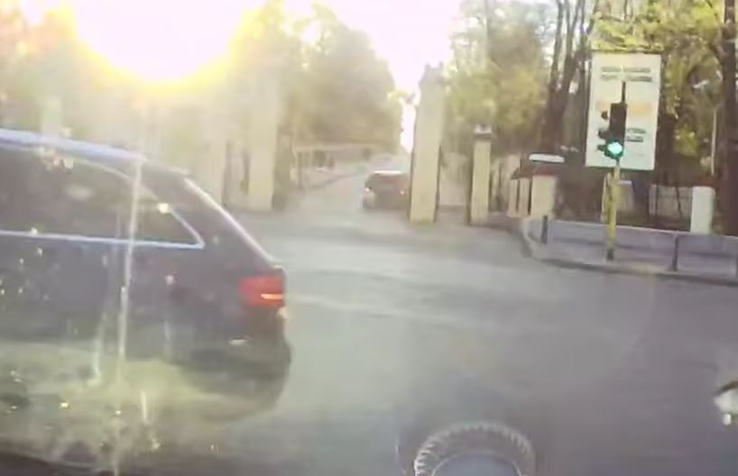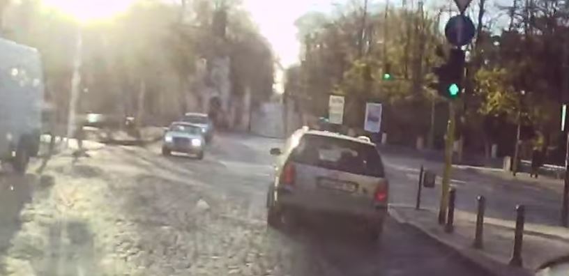Кола навлиза в кръстовището на зелен светофар, когато в същия момент в улицата " нахлува " черно комби, което завива наляво. Двете машини се разминават на броени метри.