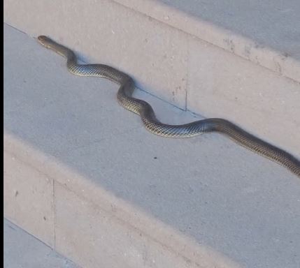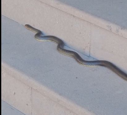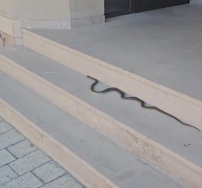 Змия изпълзя на стълбите на постройка в Пазарджик. Изглежда влечугото не се уплашило от ниските утринни градуси, а бързо-бързо пълзяло по задания.