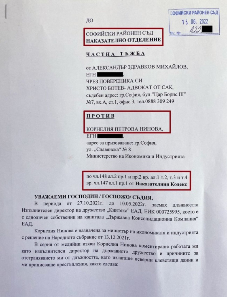 „ Корнелия Нинова отива на съд по Наказателния кодекс “. Това написа във Facebook някогашният началник на „ Кинтекс “ Александър Михайлов.