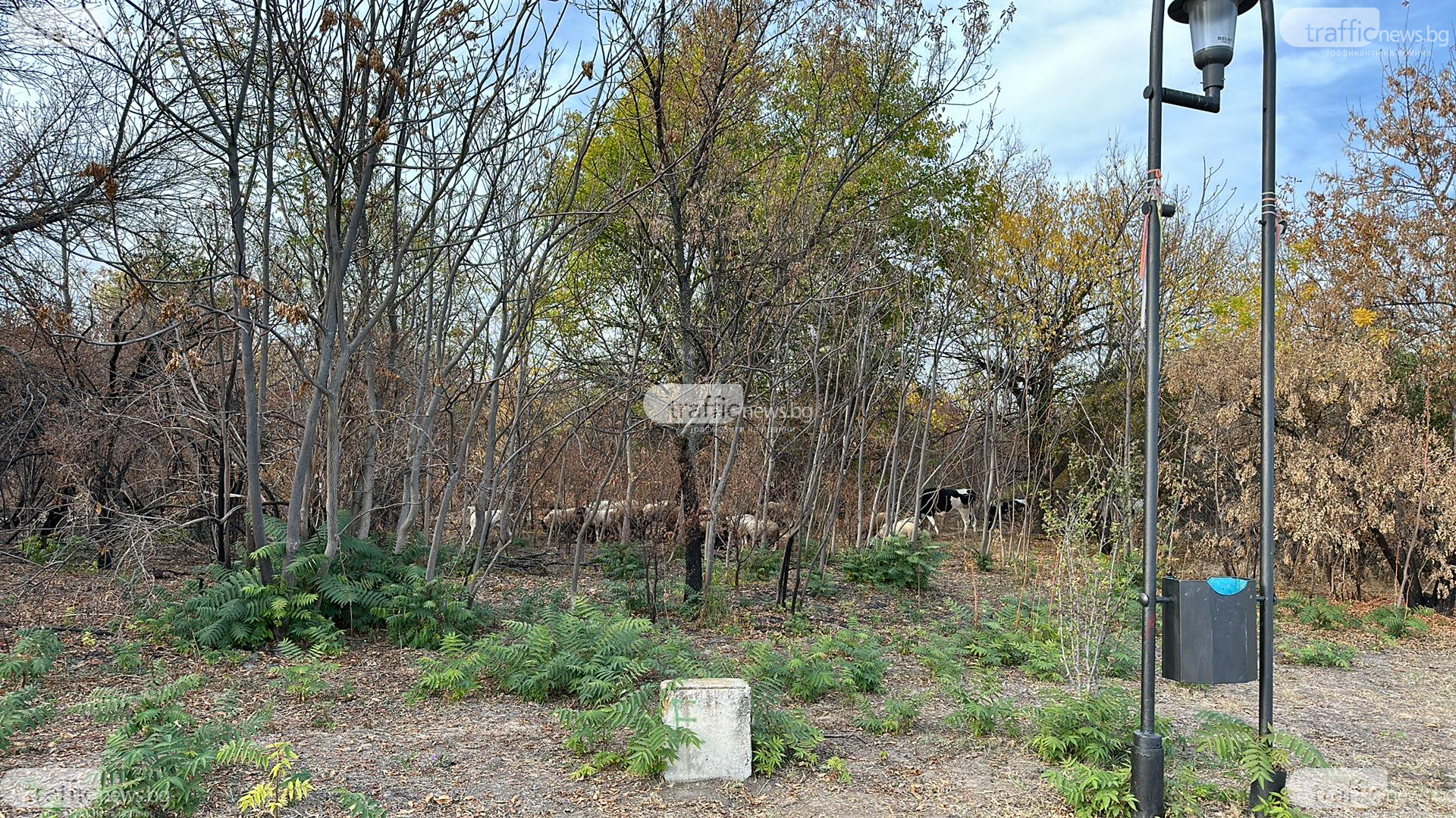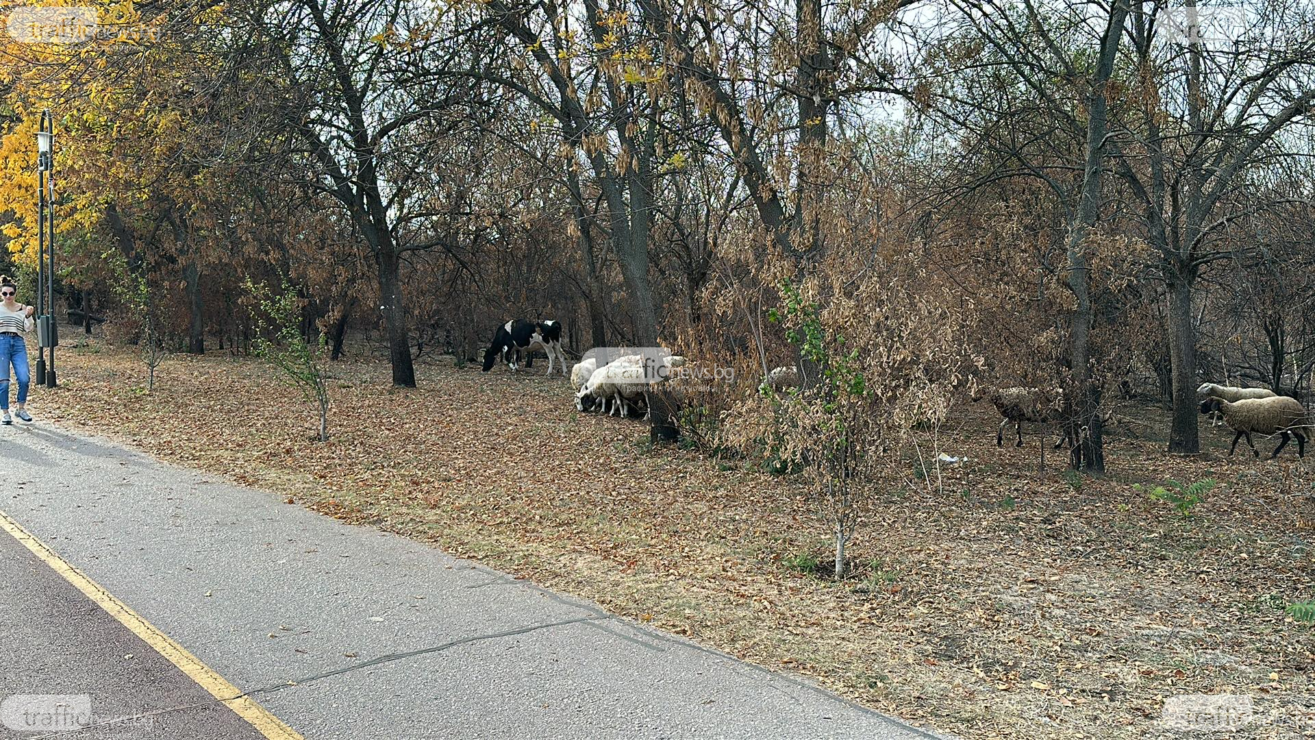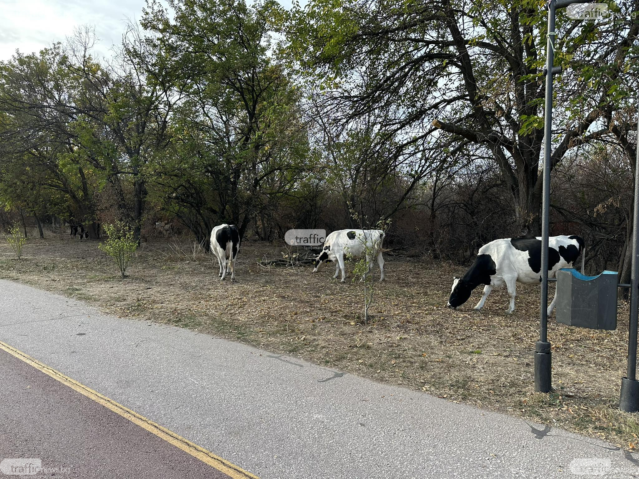 По думите на нашите читатели 15 крави и много овце пасат безнадзорно в зелените площи. Разбира се тук би трябвало да зададем въпроса- какво вършат животните на това оживено градско място и разрешено ли е да се разхождат? Според наредбите на Община Пловдив селскостопански животни могат да се отглеждат по специфичен ред. Това обаче може да се случва само в кварталите " Прослав " и " Коматево ".