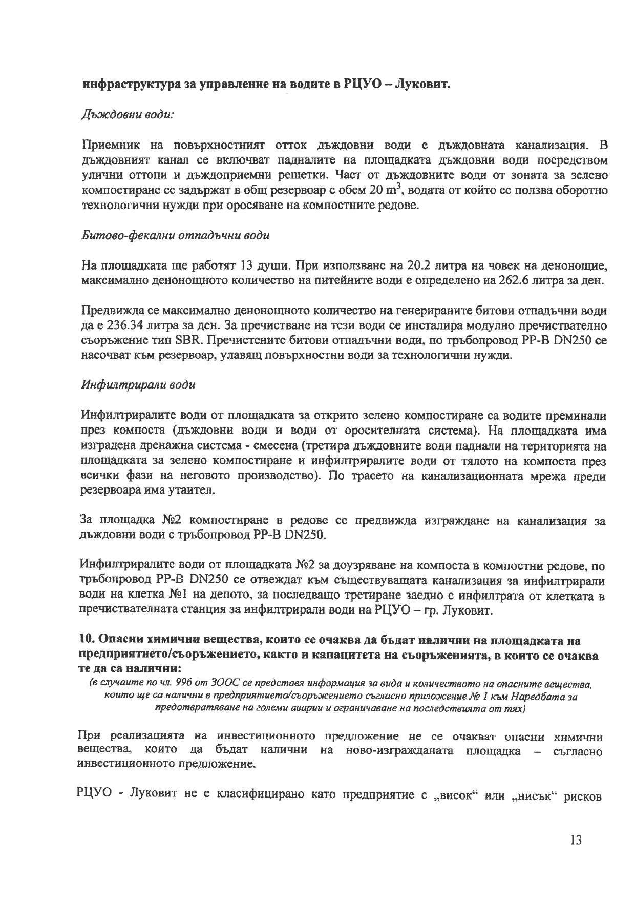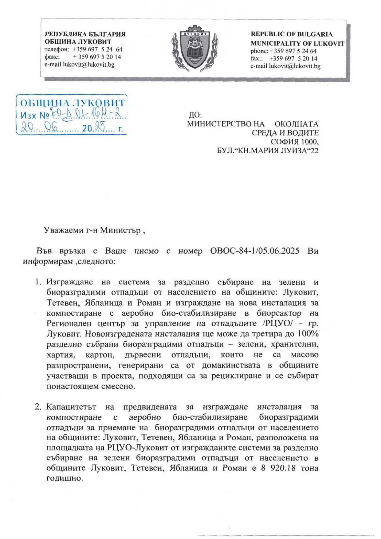 На съображение член 95, алинея 1 от Закона за запазване на околната среда и член 4, алинея 1 от Наредба за изискванията и реда за осъществяване на оценка на въздействието върху околната среда, Община Луковит афишира капиталово предложение за " Изграждане на апаратура за компостиране на биоразградими боклуци с аеробно био-стабилизиране в биореактор ", на територията на Регионален център за ръководство на боклуци - гр. Луковит, с възложител Община Луковит.