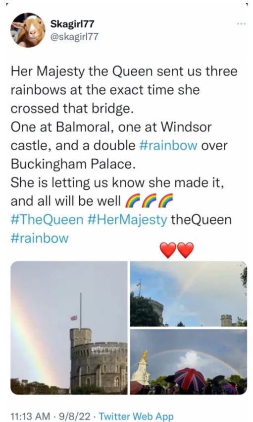 „ Нейно Величество кралицата ни изпрати три дъги сега, в който мина през моста. Една в Балтимор, една в Уиндзор и двойна дъга над Бъкингамския замък. Тя желае да знаем, че е съумяла и че всичко ще бъде наред “, написа клиент в Twitter.