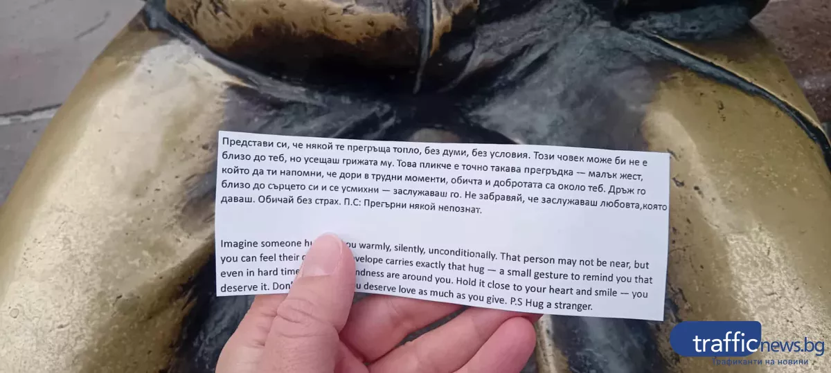 Вътре се намира малко обръщение, което предизвиква човек да си показа тиха, безусловна прегръдка, жест на поддръжка, който може да пристигна и от чужд. Текстът припомня, че „ даже в сложни моменти, обичта и добротата са към нас “ и приключва с апел: „ Прегърни някой чужд “. Посланието е предадено и на британски език, а създателят му остава незнаен.