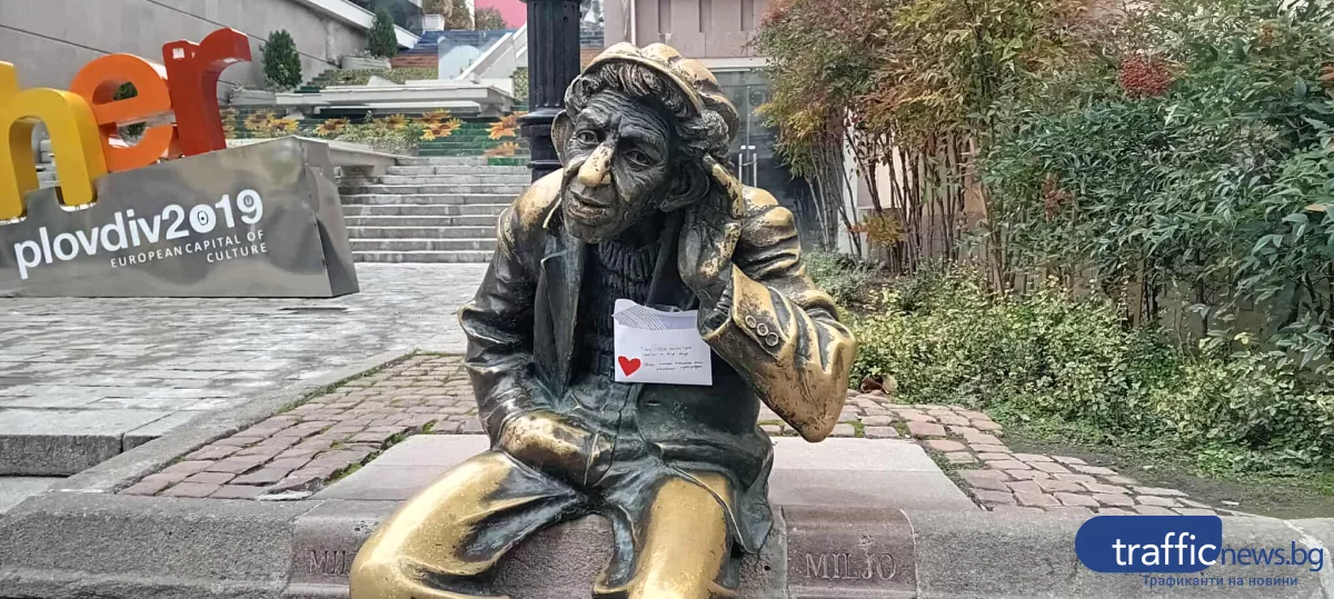 На Паметника на Мильо в центъра на Пловдив се появи необикновен жест, който притегли погледите на минувачите. Върху фигурата на емблематичния пловдивчанин, постоянно определян като знак на човешката близост и словоохотливост, е подложен пощенски плик.