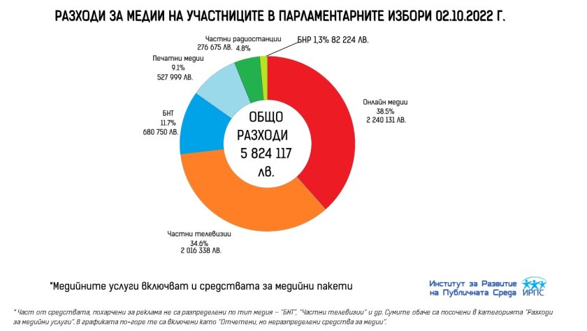 В акцията за изборите на 2-ри октомври 2022 г. средствата за медии са ориентирани главно към онлайн платформи (2 240 131 лева или 39%) и частни телевизии (2 016 338 лева 35%). Най-малко пък са разноските за БНР – 82 224 лева (1.3%) и частни радиостанции – 276 675 лева (4.8%).