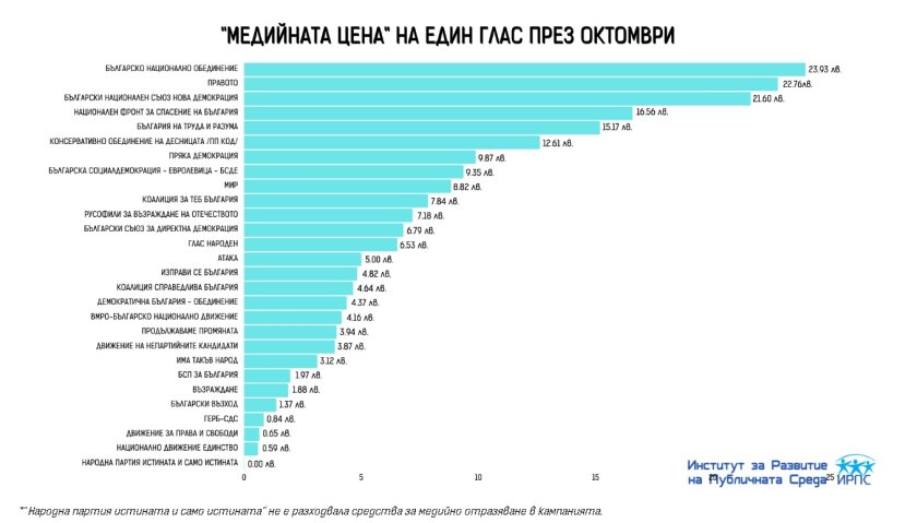 Най- ”скъпи ” са били гласовете на гласоподавателите на БНО, Правото и Български народен съюз – НД. И трите са формирали 100% от медийните си разноски посредством медийни пакети. Същите са взели участие и в акции през предходната година, в които са съумели да получат сред 79 965 лева и 119 909 лева държавна поддръжка за медийните си изяви.