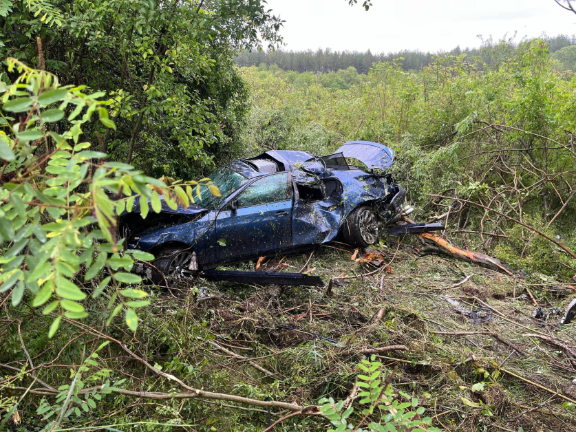 Синьото BMW е смачкано до неразбираемост. Дървета – съборени. Части – разхвърляни. Колата – изхвърлена в канавката. Причината? Вероятно аквапланинг. Истинската причина? Безотговорност. Несъобразена скорост. И систематична непросветеност зад кормилото.
