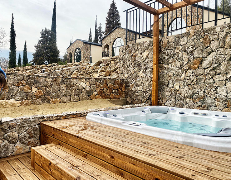 20-МЕТРОВ БАСЕЙН И ДЖАКУЗИ ПОД ОТКРИТО НЕБЕ Уелнес зоната е ситуирана в сърцето на комплекса, ловко вписана в ландшафта с красиво съчетани естествени материали. Да се запазят духът на мястото и хармонията с природата е било водещо при основаването ѝ. Свързана е с хотела с топла връзка.