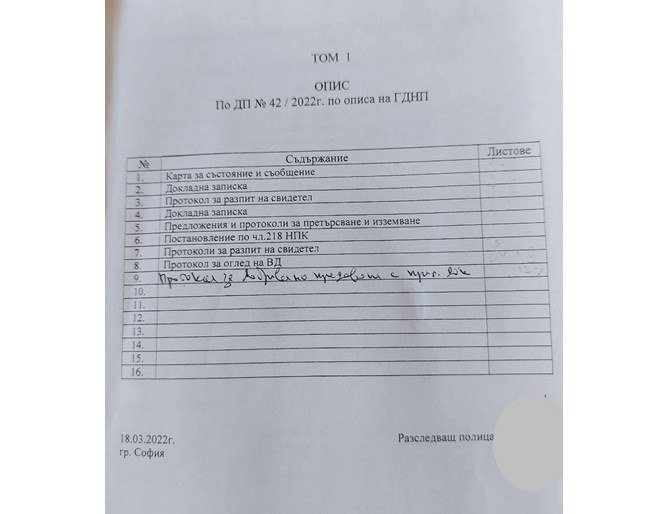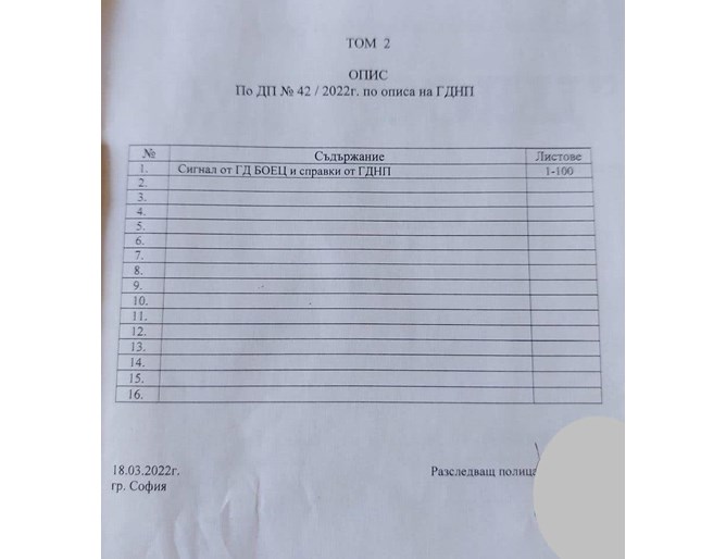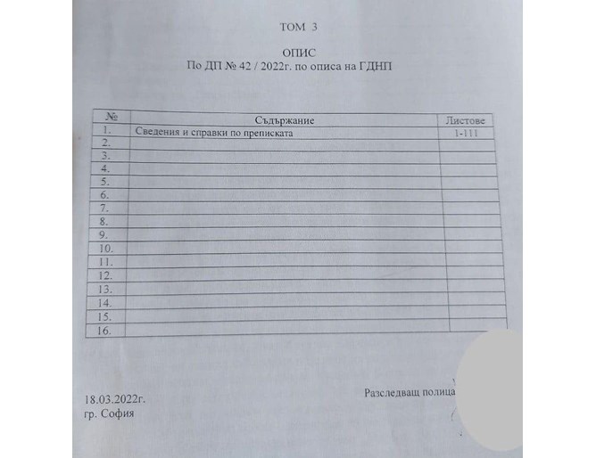 На фотосите виждате формалните описи на постъпилите от Групово дело „ Национална полиция “ в Софийска градска прокуратура четири тома с материали по досъдебно произвеждане по отношение на три политически лица.