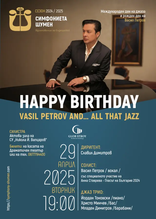 В България Васил Петров и измежду най-известните джаз реализатори, обичан от публиката и от сътрудниците си музиканти. По щастлива случайност той е роден на 30 април, а цялата му кариера е белязана от джаз музиката, утвърждавайки го като една от най-големите митове във вокалния джаз на България. За двата концерта в Шумен и Силистра, той е подбрал репертоар от типичен джаз стандарти в симфонични версии, международни шлагери и кино тематики, като Summertime на Джордж Гершуин (1935), Feeling Good на Антъни Нюли и Лесли Брикус (1965), изпълнена от Нина Симон, и What a Wonderful World от Боб Тийл и Джордж Вайс (1967), записана от Луис Армстронг. Публиката ще се наслаждения на неповторимото комбиниране сред симфонична музика и джаз импровизации, които ще завладеят сърцата ѝ и ще я пренесат в света на огромните джаз реализатори.