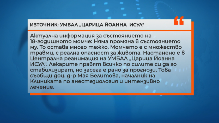 От болница " Царица Йоанна " споделиха, че положението на 18-годишното момче остава в тежко положение, с заплаха за живота, с голям брой контузии. Състоянието на останалите потърпевши, настанени в " Пирогов " и Окръжна болница остава тежко.