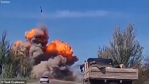 На фрагментите се вижда, че оръдейна кула на танка остава изцяло непокътната, до момента в който хвърчи на 250 фута (76 м.) във въздуха над натоварения път в раздрания от война Мариупол.