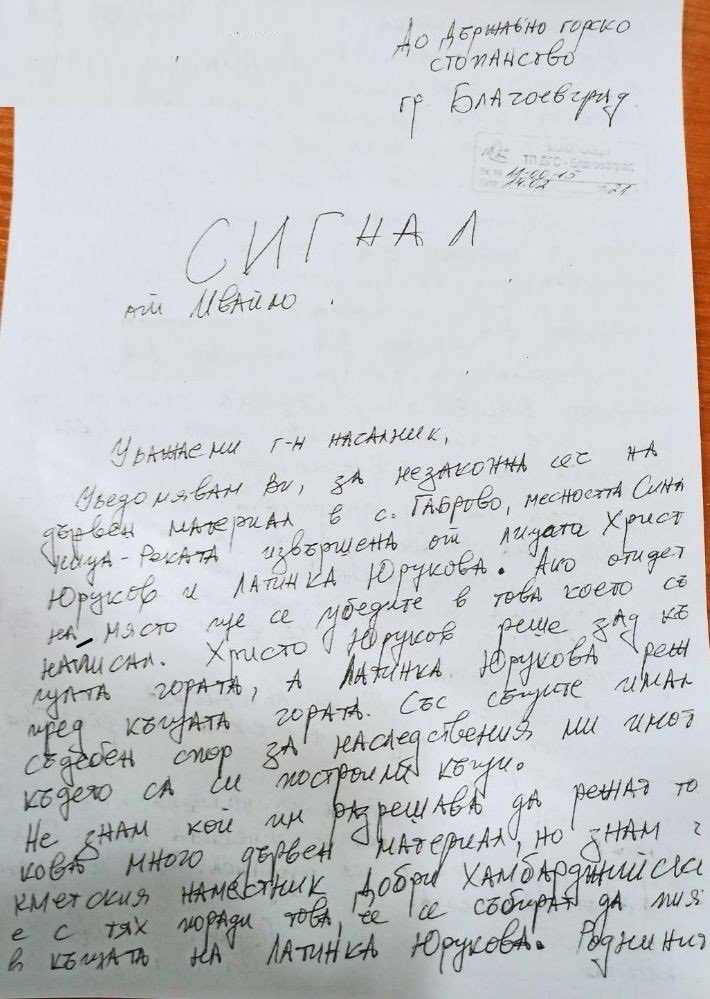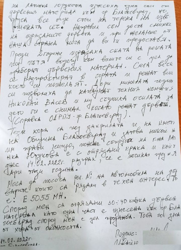 За поголовната сеч на дъбовата гора алармира и притежател на парцел в района, който в сигнал до горските в детайли разказва варварството и основните настоящи лица – Христо Юруков и неговата снаха - Латинка.