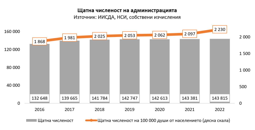 На всеки 100 хиляди души у нас през 2022 година са се падали 2230 служители. Това е с близо 20% повече по отношение на шест години по-рано, демонстрира последният отчет за администрацията, утвърден от Министерския съвет предходната сряда, написа