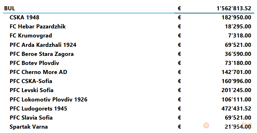 Справка демонстрира, че най-голяма сума ще получи първенецът на България Лудогорец. На разградчани ще бъдат изплатени 472 431 евро, а в касата на Левски ще влязат 201 245 евро.
