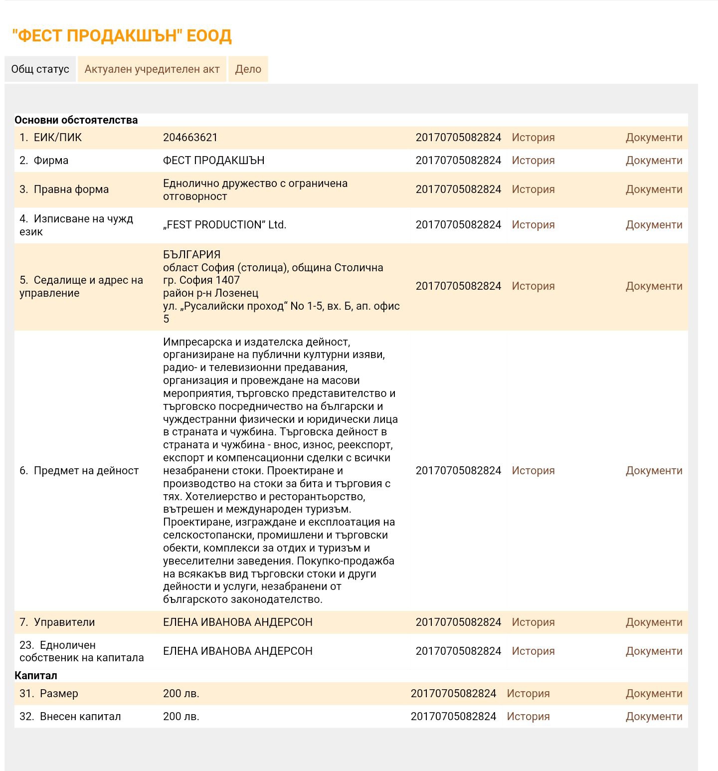 Това беше задоволително да ме стимулира да стартира да дълбая и компанията уредник се оказа " Фест Продакшън " ЕООД основана особено за случая на 05.07.2017 година със притежател лицето Елена Иванова Андерсон обвързвана с безчет компании ползвам линк за по любопитните: