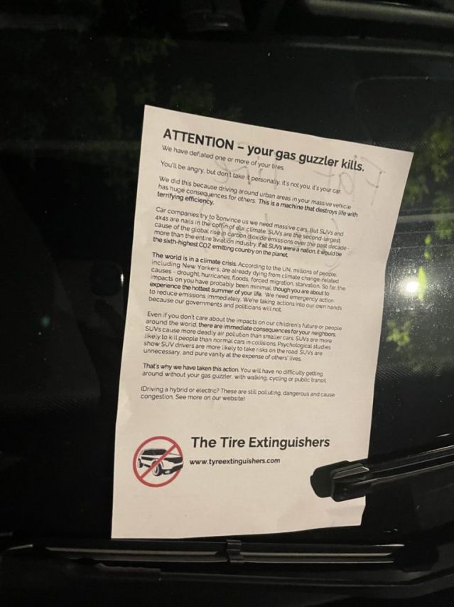Над 180 автомобила с нараснала проходимост осъмнаха със спаднати гуми в западен Лондон, откакто група от екоактивисти с името Tire Extinguishers взеха решение да стачкуват още веднъж. Групата се бори против тежките и огромни SUV-та в огромните градове, като се пробва да откаже хората от потреблението им посредством упоменатия способ за намаляване на гумите.