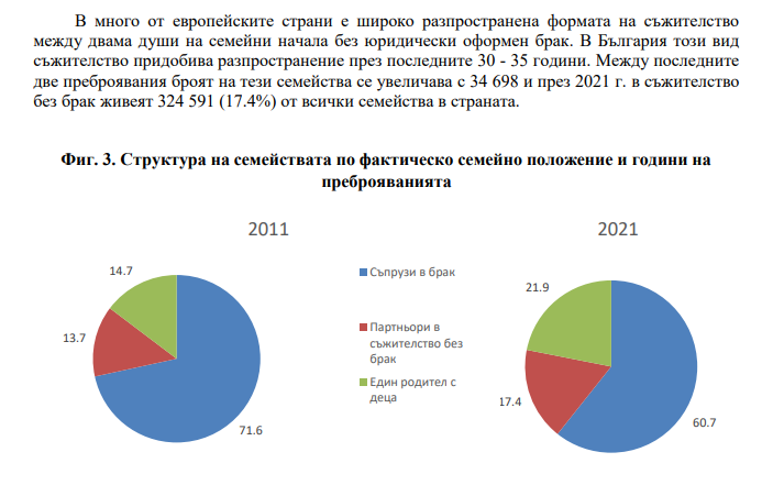При анализиране на фамилиите от един родител с деца съгласно юридическото фамилно състояние на родителя се открива, че през интервала 1985 - 2021 година непрестанно се усилва броят на неженените родители (самотни майки и бащи) - от 4 762 през 1985 година на 92 247 през 2021 година, или повишаване с 20.3 процентни пункта. Семействата на овдовелите родители с деца също се усилват и през 2021 година те са 40.2% от всички непълни ядрени фамилии. Броят на фамилиите, формирани от един родител, който юридически се води в брак, само че в действителност самичък отглежда децата си, се усилва съвсем през целия интервал 1985 – 2021 година. Между последните две преброявания тези фамилии нарастват с 8 049 броя и към 7.09.2021 година относителният им дял от всички непълни ядрени фамилии е 13.4%. През интервала 2011 - 2021 година понижава броят на фамилиите, формирани от разведени родители с деца. Техният условен дял към 7.09.2021 година е 23.9% от всички фамилии, формирани от един родител с деца.