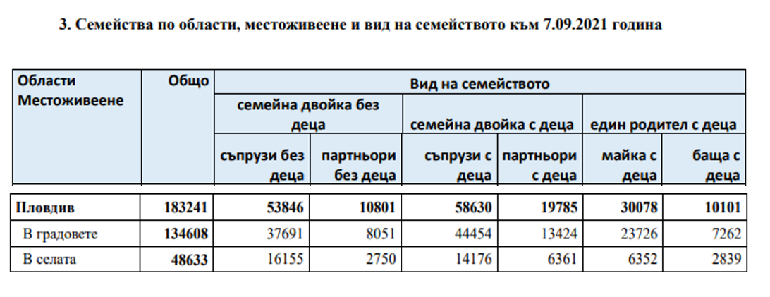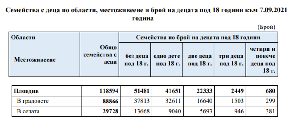 Предвид, че фамилиите с двама сътрудници, които отглеждат деца в Пловдив и района, са 78 415, то излиза, че всяко трето семейство с деца в Пловдив е формирано единствено от един родител.