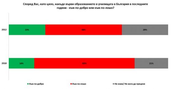 На въпрос „ Според Вас, като цяло, накъде върви образованието в учебните заведения в България в последните години, към по-добро или по-лошо? “ 16% от интервюираните дават позитивен отговор. За сметка на това, отрицателният дял отговори е 63%. 21% не могат да преценяват. През 2012 година, в подобен сондаж на „ Галъп интернешънъл “, 23% дадоха отговор положително на този въпрос, а 48% отрицателно. Останалите се колебаеха.