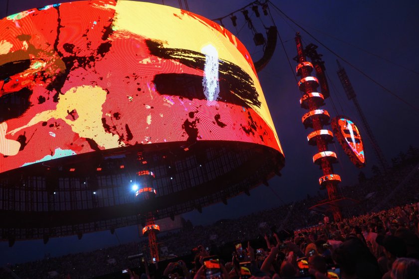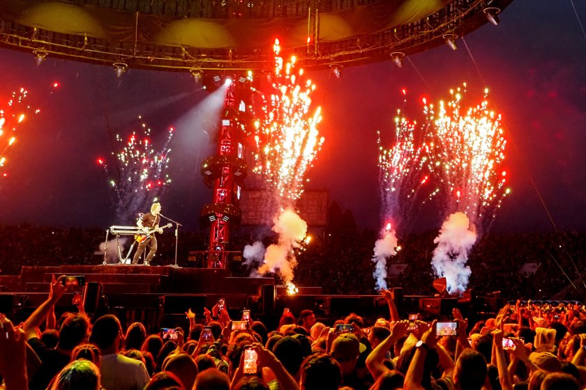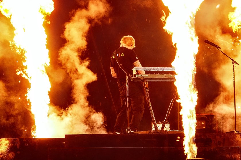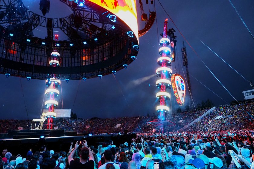 Огромната 360-градусова сцена и видеоекраните във форма на перца за китара направиха шоуто още по-зрелищно, а периодичнят дъжд над столицата ни минимум не тормози Шийрън и хилядите фенове: