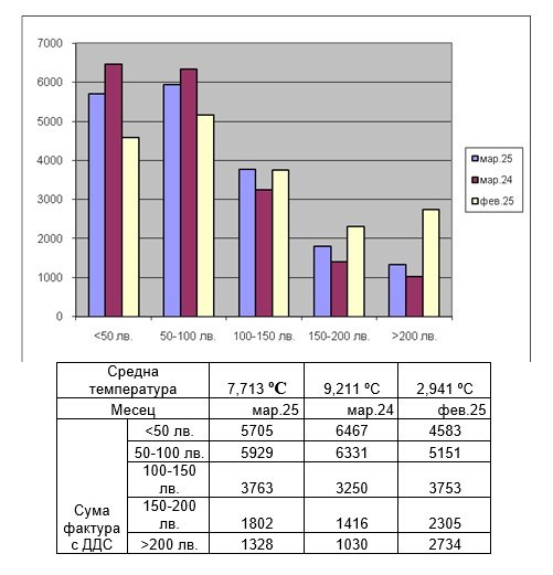 Разпределението на сметките за март 2025 година по стойностни групи демонстрира следното: