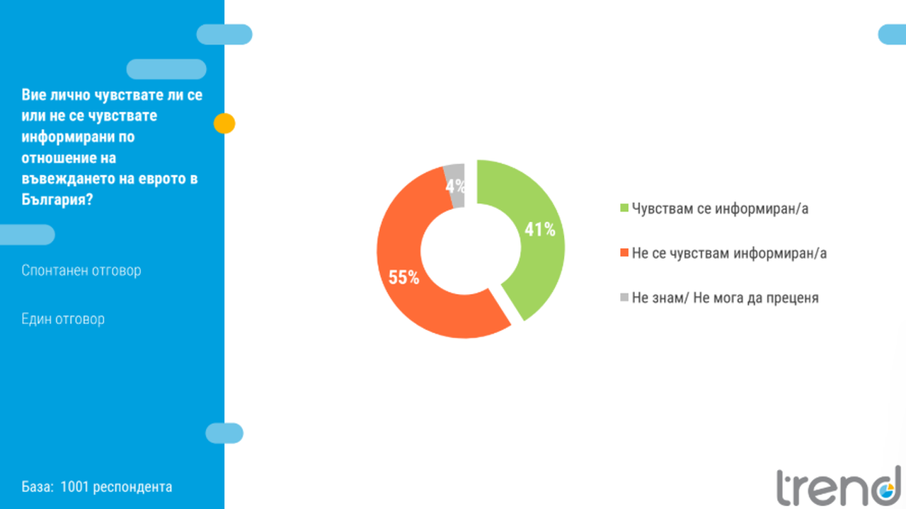 Над половината (55%) от българските жители не се усещат осведомени във връзка с въвеждането на еврото в България. 41% се усещат осведомени. По-ниска степен на осведоменост се следи измежду хората на възраст над 60 години и измежду етническите малцинства. Сред висшистите над половината се усещат осведомени.