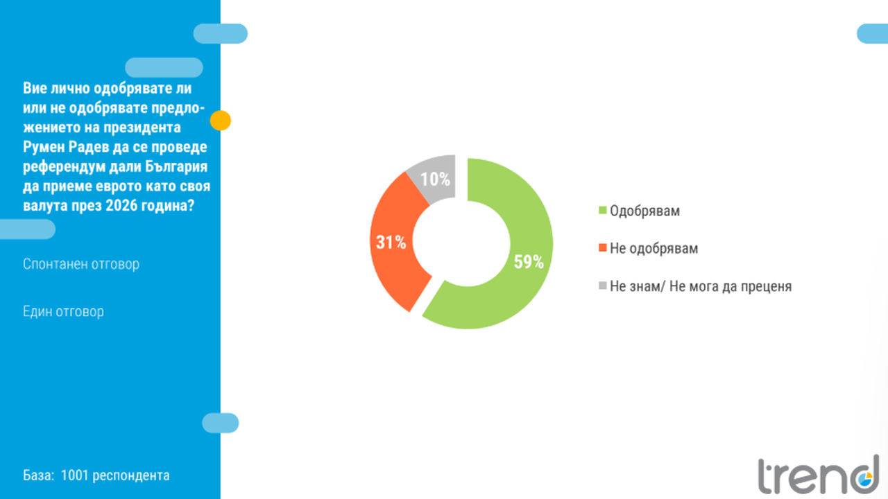 59% от интервюираните утвърждават самодейността на президента Радев за осъществяване на референдум по отношение на приемането на еврото в България през 2026 година 31% не поддържат сходно допитване.