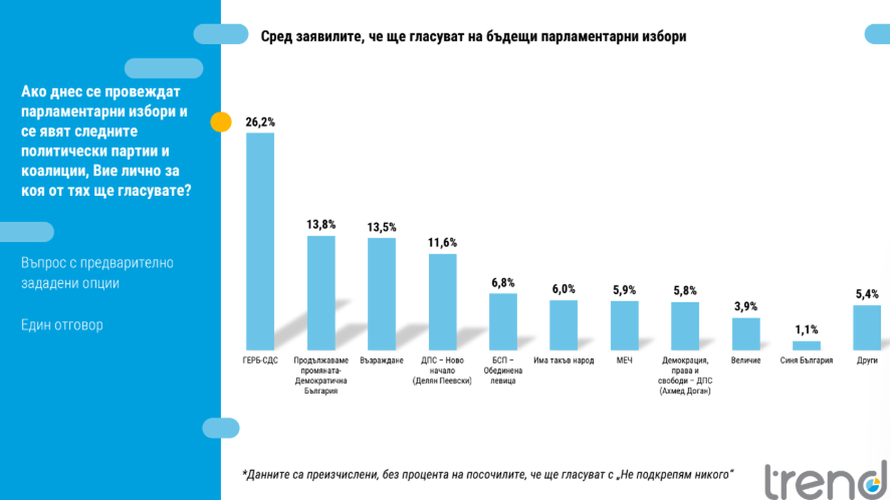 Тренд“: ГЕРБ остава първа сила, ръст при ДПС-НОВО НАЧАЛО, АПС на Доган изпада до осма позиция