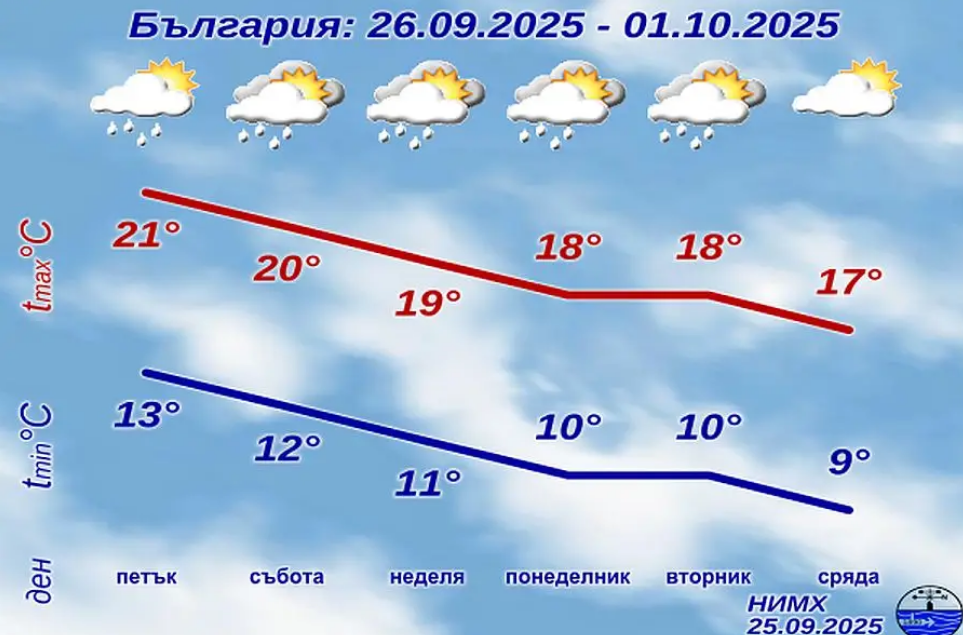 До края на седмицата с сдържан, в Източна България и краткотрайно мощен изток-североизточен, вятър температурите ще продължат да се намаляват и оптималните в неделя ще бъдат сред 16° и 21°, минимални – сред 7° и 12°, по Черноморието до 15°-16°. Облачността ще е най-вече забележителна и тук-там, основно в западната половина от страната и в югоизточните региони, ще има превалявания от дъжд; в неделя на повече места по Черноморието ще превалява дъжд.