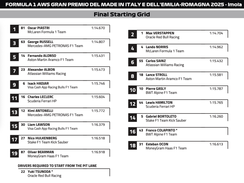До австралиеца на първата редица ще застане Макс Верстапен, а от втория ред ще потеглят Джордж Ръсел и вторият водач на Макларън Ландо Норис. Топ 10 на стартовата решетка ще оформят Фернандо Алонсо, Карлос Сайнц, Алекс Албон, Ланс Строл, Исак Хаджар и Пиер Гасли, а едвам на шестата редица ще забележим водачите на Ферари Шарл Леклер и Люис Хамилтън. Единственият представител на домакините Андреа Кими Антонели също отпадна в края на Q2 и ще започва 13-ти в първото си съревнование като водач от Формула 1 в родината си.