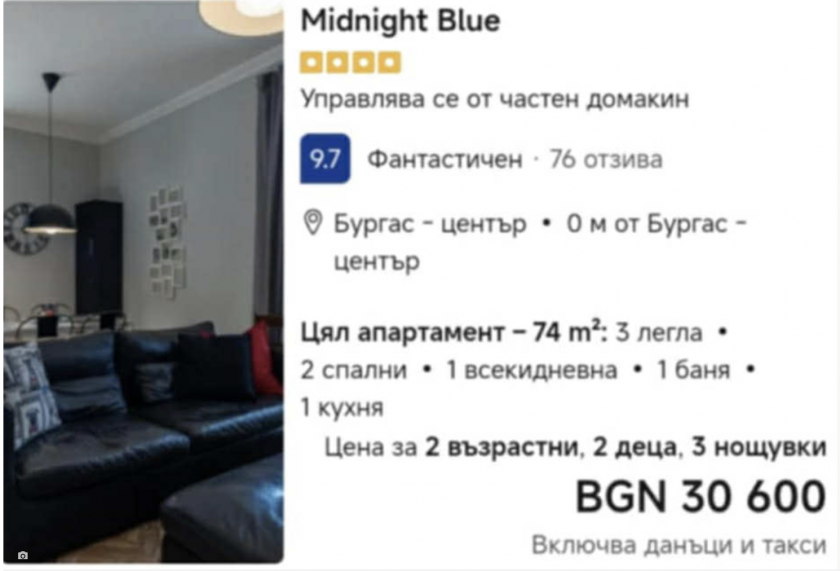 Наемодател желае шеметната сума от 30 600 лв. за три нощувки в Бургас, а обявата е оповестена в огромна платформа с места за настаняване.
