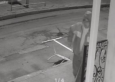 На фрагментите виждаме мъж в качулка, който минава с тротинетка около обекта. Той подминава, само че след това се връща и се насочва към парапета. След това съумява да откачи парче мрежа, което навива на руло и взема със себе си.