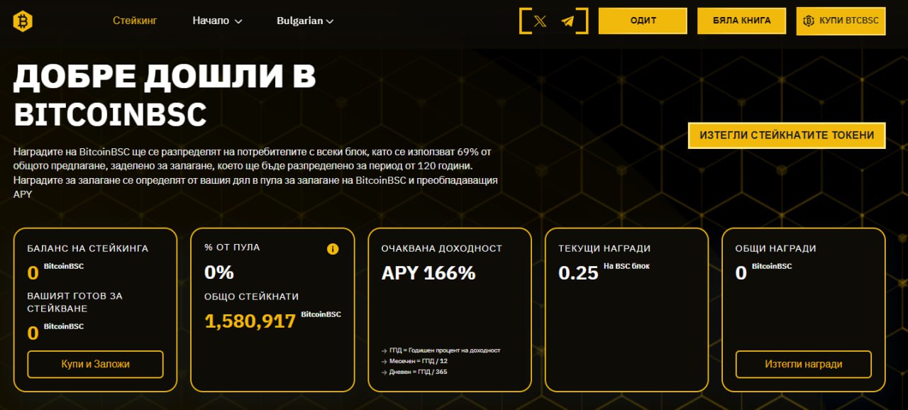 Bitcoin BSC предлага сегашна рентабилност от 174%, като вложенията в стейкинг пула са над $1.5 милиона (от общо събраните към този момент над $3 милиона).
