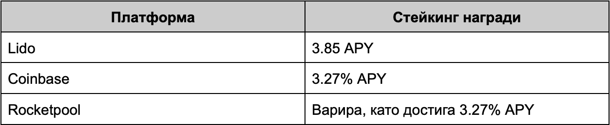 Ако пък обичате да стейквате токени, то в идната таблица ще видите главните крипто платформи, предлагащи награди, като сами ще се убедите за какво крипто стейкърите подценяват Ethereum .