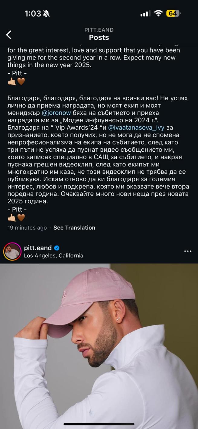 „ Не знам от кое място да стартира. Не съумях персонално да приема премията си, само че екипът ми и мениджърът ми бяха на „ VIP AWARDS’24 “ и одобриха премията ми за „ Моден инфлуенсър на 2024 “. Благодаря на Vip Awards за признанието, което получих, само че няма по какъв начин да не загатна непрофесионализма на екипа на събитието, откакто не съумяха да пуснат видео посланието ми, което записах особено в Съединени американски щати за събитието. Няколко пъти техният екип се опитваше и след третия път те пуснаха неверен видеоклип. Моят екип неведнъж им сподели, че това видео не би трябвало да се разгласява. Искам още веднъж да ви благодаря за огромния интерес, обич и поддръжка, която ми оказвате към този момент втора поредна година. Очаквайте доста нови неща през новата 2025 година “, написа Pitt.