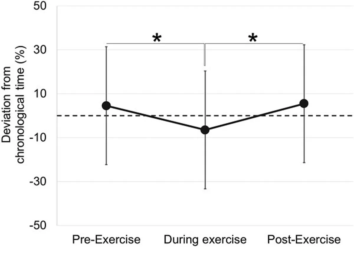 Графика, показваща отклонението от хронологичното време по оста y и три времеви точки – преди, по време и след подготовка – по оста x. По време на тренировката се следи спад до към -9%, а звездите на графиката демонстрират, че разликата е статистически значима спрямо времевите точки преди и след тренировката. Снимка: Edwards et al, Brain and Behavior 2024 (CC BY 4.0)