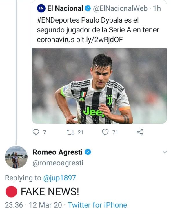 Нападателят на Ювентус Пауло Дибала не е инфектиран с ковид, без значение от изказванията на венесуелското издание El Nacional, което написа, че аржентинецът се намира под карантина.