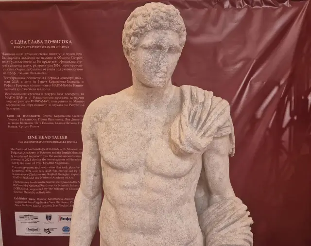 Напълно реставрираната антична мраморна скулптура в човешки растеж, открита през 2024 година в Хераклея Синтика от екипа на проф. доктор Людмил Вагалински, беше показана за първи път – изправена и с глава на раменете.