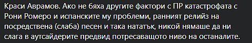 Наполовина българинът, както самичък се дефинира, Рони Ромеро и „ супергрупата му” „ Intelligent Music Project” несполучливо се пробваха да показват страната ни на „ Евровизия 2022”. Те се оказаха в челната тройка, само че в обратна посока.