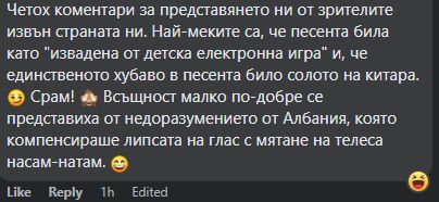 За разлика от колежката си Поли Генова, която стигна до финала, въпреки че не съумя да завоюва, с парчето If Love Was A Crime, Рони и неговата „ умна музика” не съумяха да покорят сърцата най-малко на българската аудитория. Дори тъкмо противоположното! Социалните мрежи се заляха от отрицателни мнения за групата, представянето, песента и като цяло за всичко. Коментарите са от неодобрителни до прям хейт и слагат един главен въпрос: „ Защо тези момчета бяха изпратени на екскурзия до Италия, макар че почитателите отсамото начало не са харесали кандидата и песента?”