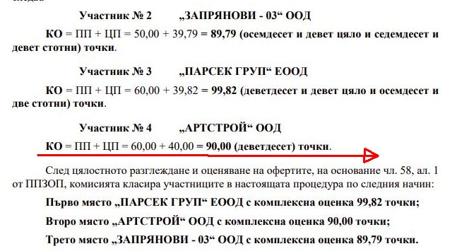 Третата компания е била смолянската „ Артстрой ” на нея в протокола са поставени 60 точки за техническото предложение и още 40 за ценовото, защото са дали най-ниска цена. Записаният резултат обаче е 90. Въпросът е къде е грешката? В резултата или в точките?
