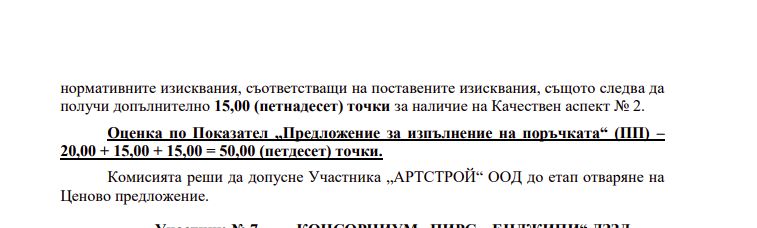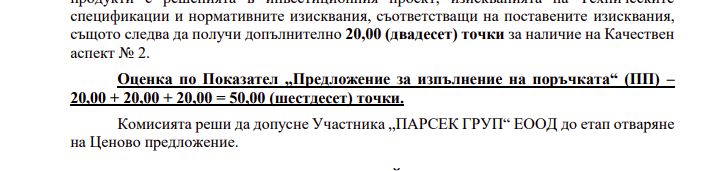 Поглеждайки нагоре се вижда, че компанията е получила 50 точки за техническото предложение, а евентуално грешката е при преместването. В оценките обаче се вижда още една неточност. Там против оценките на „ Парсек груп ” е записано 20 + 20 + 20= 50.