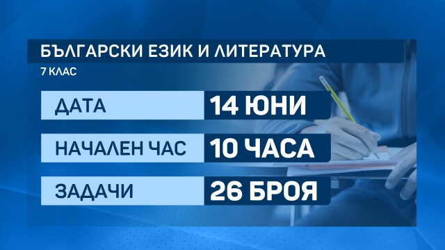 Изпитът по български език и литература е на следващия ден. За седмокласниците стартира в 10 ч. Тестът има 26 задания. От тях 18 въпроса са затворени. Шест са със свободен отговор.