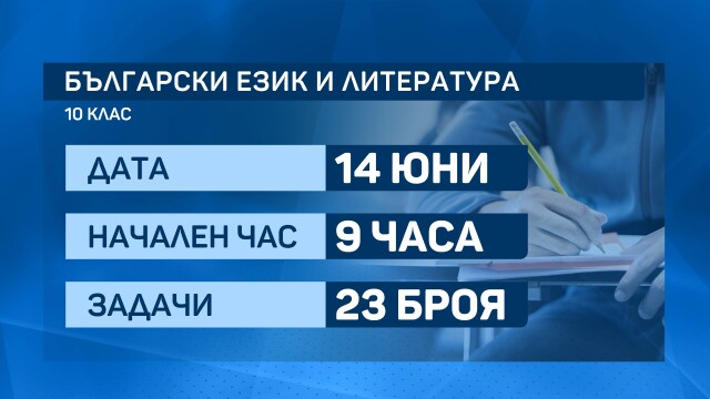 Утре знанията си по български език и литература ще покажат и десетокласниците. А по математика националното външно оценяване е на 16 юни. Резултатите ще бъдат оповестени до 28 юни.