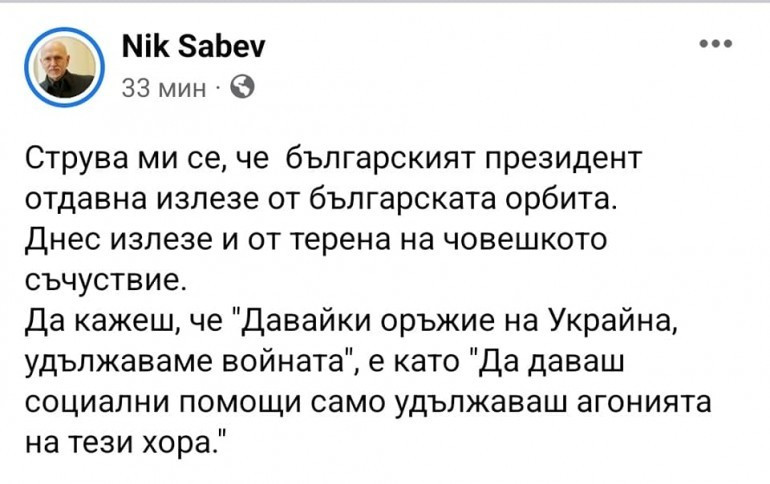 „ Струва ми се, че българският президент от дълго време излезе от българската орбита. Днес излезе и от терена на човешкото съчуствие “, написа предприемачът.