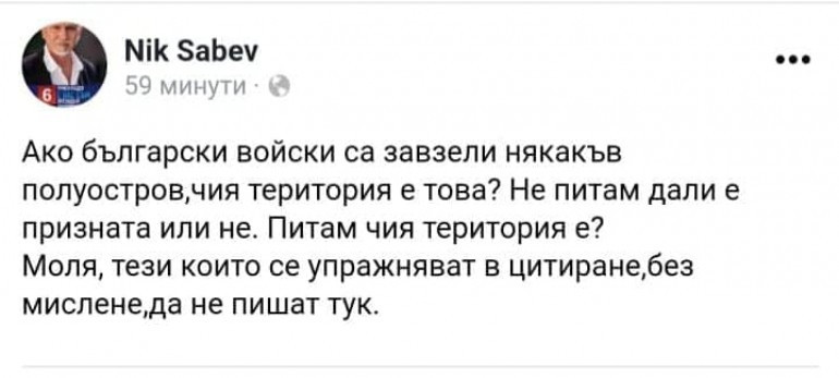 „ Ако български войски са завзели някакъв полуостров, чея територия е това? Не запитвам дали е приета или не. Питам чия територия е? Моля, тези които се упражняват в цитиране, без мислене, да не пишат тук “, написа тогава Събев в отбрана на Радев.