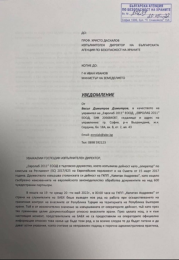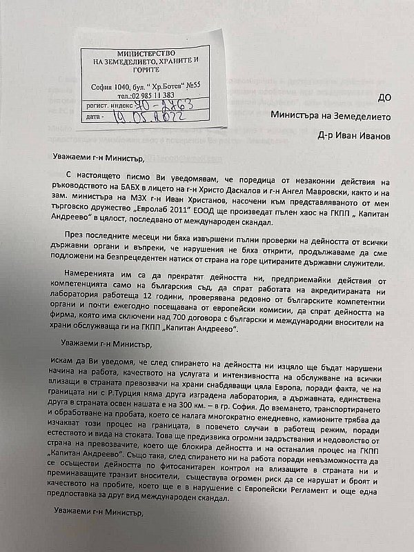 Истината, е радикално друга. Самият притежател и шеф на компанията е предизвестил земеделския министър Иван Иванов за предстоящите проблеми поради новата организация. Идентично предизвестие е връчено и на шефа на БАБХ.
