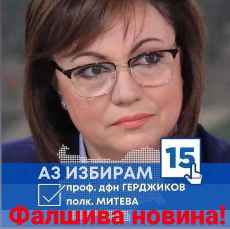 Тя разгласява пост в профила си в обществените мрежи, на който се вижда колаж с рамка на кандидат-президентската двойка проф. Анастас Герджиков и Невяна Митева. Лидерът в оставка написа, че този колаж е подправен и се дължи на „ задкулисието”, за което тя приказва от два дни.